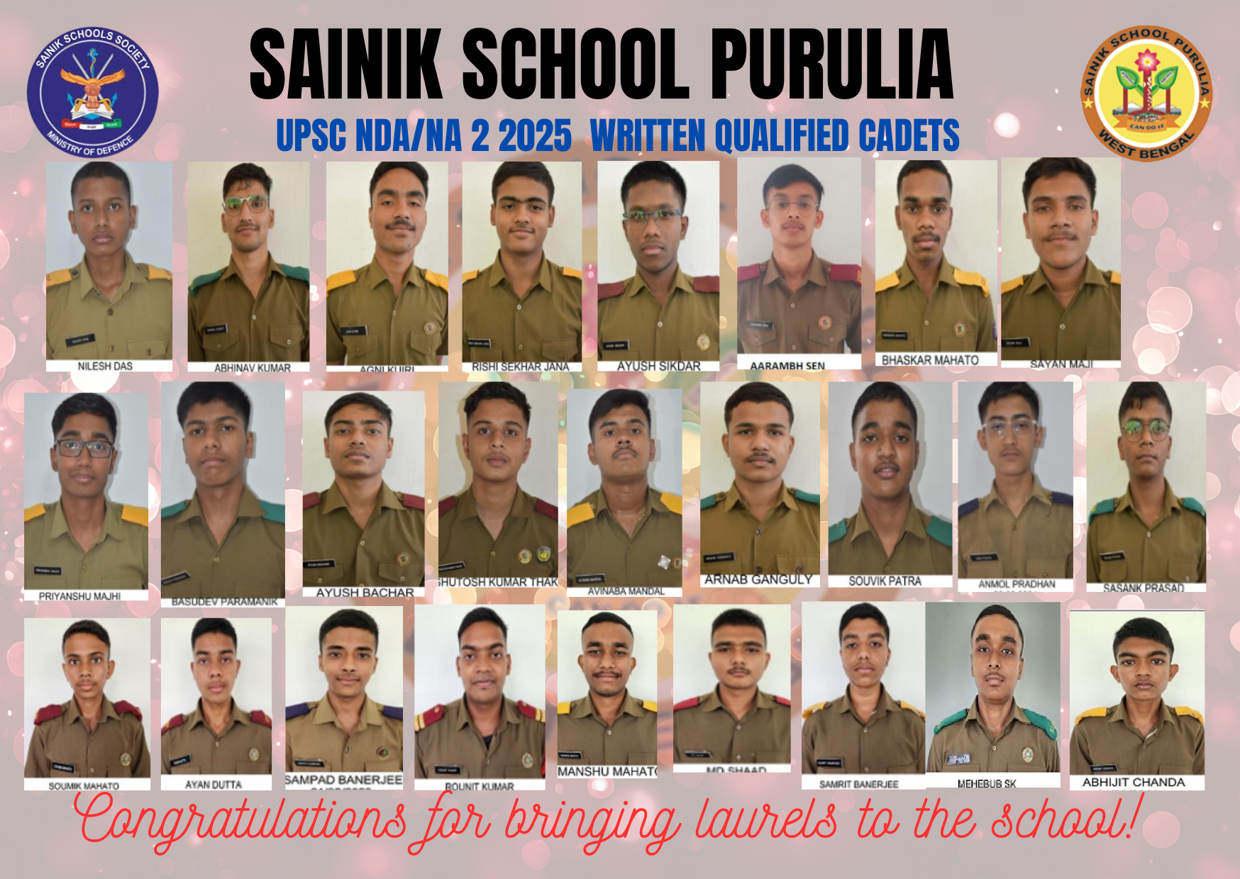 Sainik School Purulia is one of the 33 Sainik Schools in the country and one of the prestigious English medium residential public schools in the state of West Bengal. It was established in the year 1962 under the aegis of the Ministry of Defence for the removal of regional imbalances in the officer‘s cadres of Defence Services in India. The school is situated in the idyllic foreground of the Ayodhya Hills, covering an area of 279 acres on the Purulia-Ranchi Road in the close vicinity Of Sidho Kanho Birsa University , 04 km away from Purulia town, which is a district headquarters. Over the years the school proved its excellence in all spheres. With an objective to prepare the students academically, physically and mentally for entry into the National Defence Academy, the school laid emphasis on a holistic education system. The School is managed by three tier system of management ,Sainik Schools Society (Ministry of Defence) as its apex body , Local Board of Administration and the School staff comprising of Principal,Vice Principal, Administrative Officer, Academic and Administrative staff